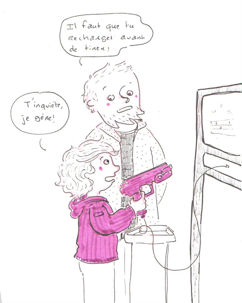 Mercredi. Jour des enfants à la médiathèque. J’aime tellement voir les petits s’approprier les lieux, découvrir les livres, jouer. Et puis, parfois, un enfant marque la journée par une remarque rigolote, un geste ou une super tenue comme cette fidèle petite lectrice. Je n’ai pas pu résister à l’envie de la croquer.