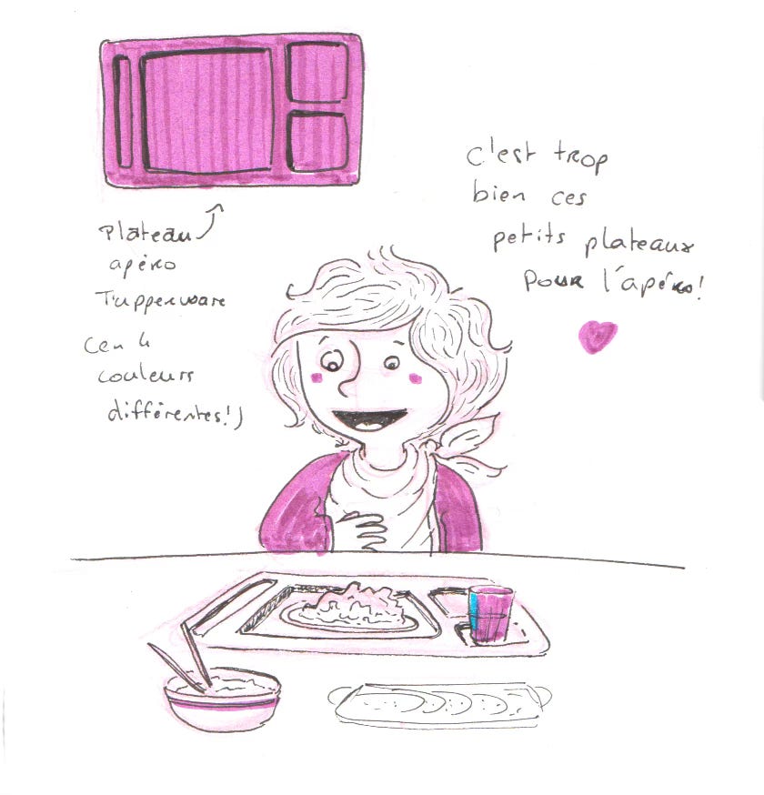 Mardi. Après des mois de recherches, sur Vinted et le bon Coin, j’ai enfin trouvé 4 plateaux repas Tupperware. Ils sont vintage à souhait et tellement top pour manger sur la table basse du salon. Il y a un petit garçon qui était bien content de les tester. Vive les apéros dinatoires !