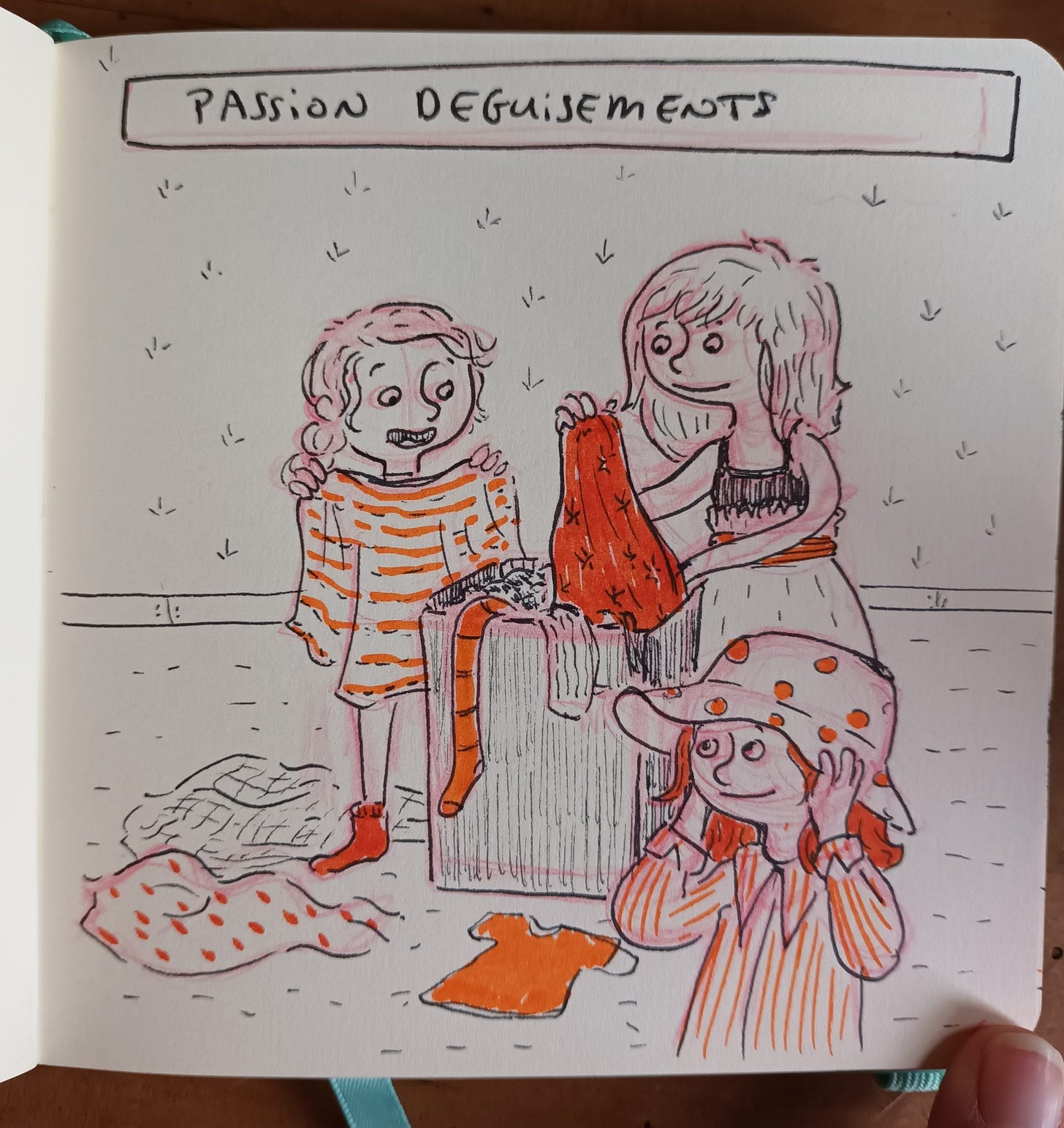 Un de mes jeux préférés, lorsque que j’étais petite, c’était les déguisements ! Avec ma petite sœur et ma meilleure amie, nous passions des après-midi à fouiller dans le carton des déguisements : chemises et chemisiers des années 70, jupes de maman, chapeaux et bobs à gogo, sacs à main et bijoux tombés en désuétude.