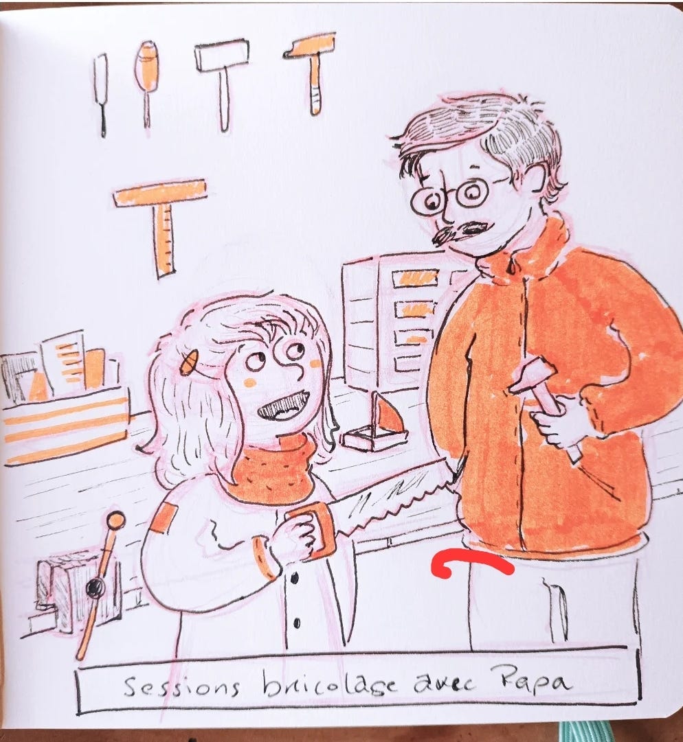 Et parfois, je bricolais avec Papa. C’était super de créer et imaginer des choses avec lui. Mon père est très doué, en bricolage. Je me souviens d’avoir construit un petit bateau en bois, aidé pour des petits travaux (en tenant principalement les bouts de bois entre eux), participé à la construction de la cabane pour notre poney.