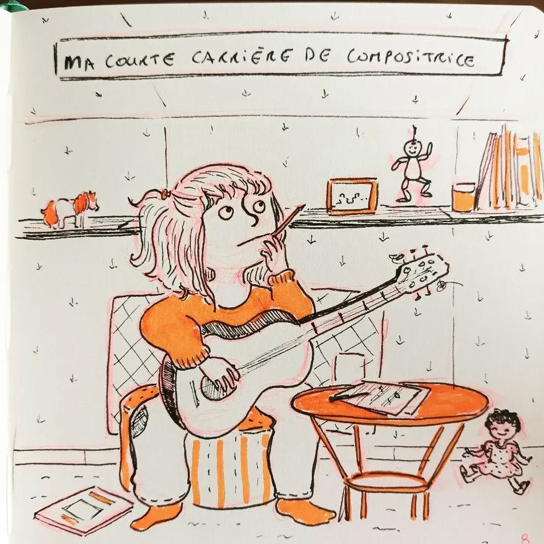J’avais le rêve de devenir chanteuse, guitare/voix, comme Francis Cabrel. Je me suis donc essayé à la composition de chanson, avec des paroles très mélancoliques (Francis Cabrel for ever) et une mélodie... qui avait le mérite d’exister. Ma carrière de compositrice s’est arrêtée à un morceau.